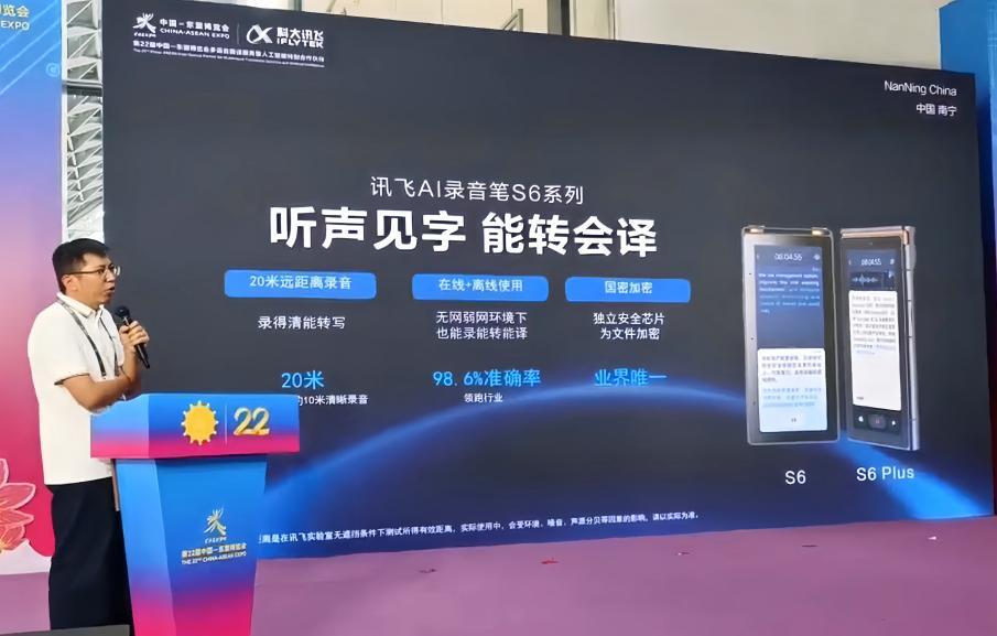 中国—东盟博览会秘书处秘书长韦朝晖引见,讯飞 AI 录音笔 S6 系列不只实现 20 米超远距精准拾音,